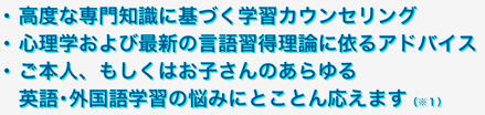 「独学で英語を習得したい」、「子供をバイリンガルに育てたい」、「海外から帰国したばかりの子どもの語学力を、将来に渡って維持させたい」など、英語・外国語学習のあらゆる相談にお応えします。相談を請け負うのは米国の大学院で英語教授法の修士号をとり、専門知識も豊富な当学院の代表講師、単に英語ができるだけの「自称」アドバイザーではありません。カウンセリングでは北米を中心に研究されている最先端の言語習得理論や、統計データから分かる日本人の弱点などに基づき、あなたの悩みに様々な角度からメスを入れ、専門知識に基づいたアドバイスを行います。