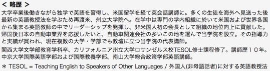 ・企業の社員英語教育、大学の特別英会話講座、生涯学習センター等の講師を歴任